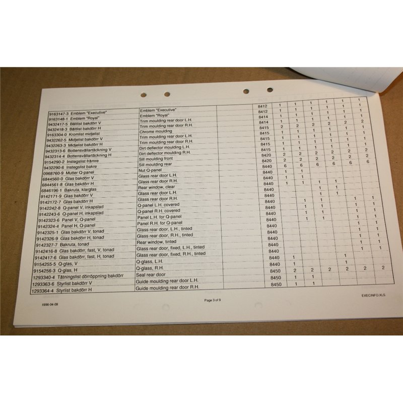 Volvo 960 Executive 1996.Lista med artikelnummer på 9 sidor.